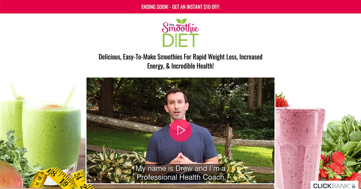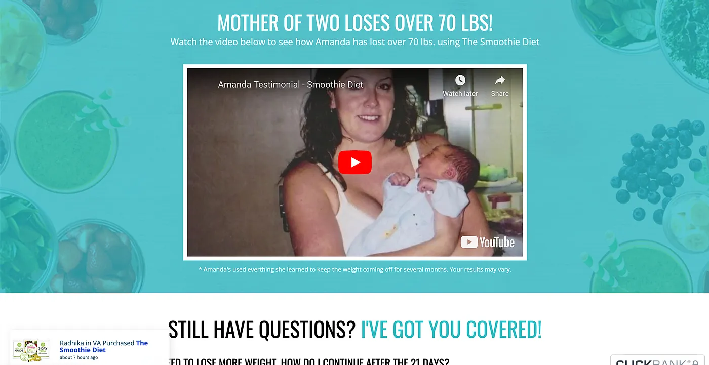 In the example, the bridge page includes a video from the founder who personally describes the benefits of the product, along with client testimonials and a limited-time promotional offer highlighted in red.