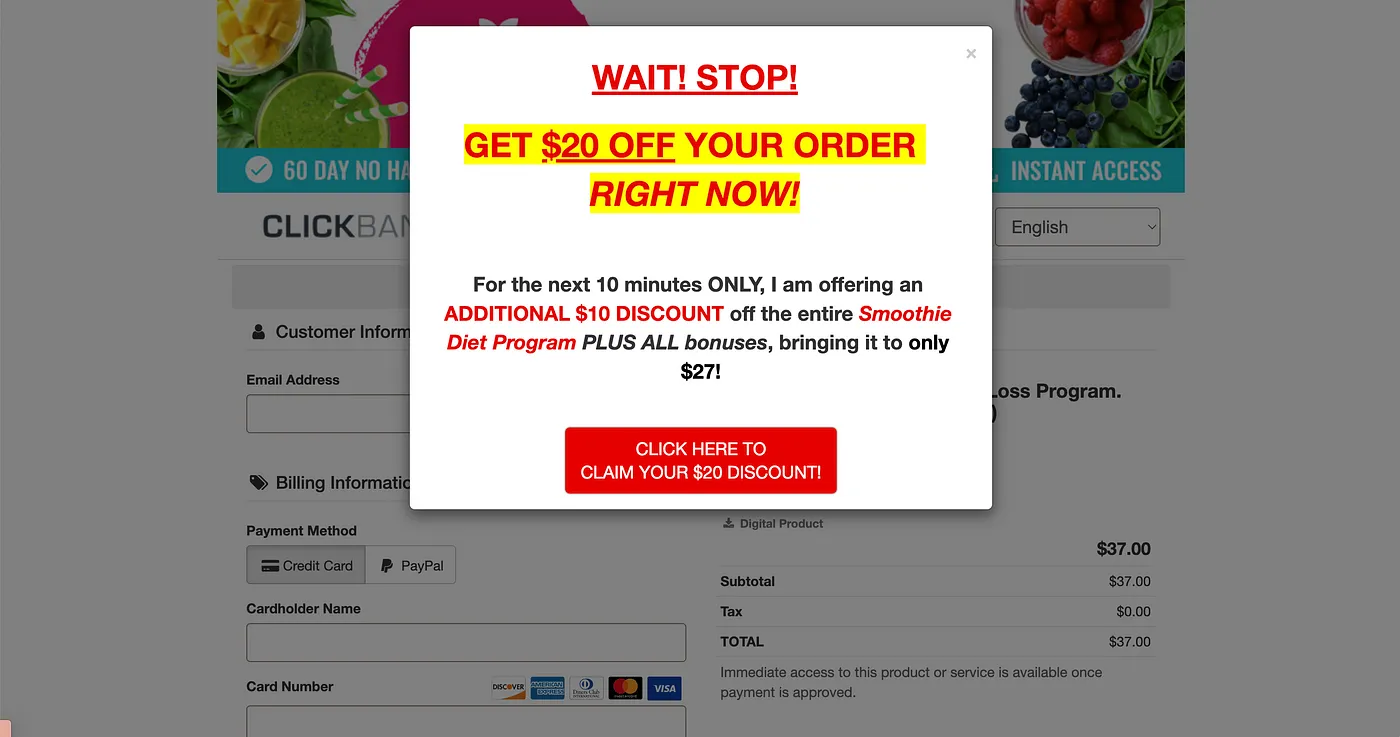 If the visitor is still not ready to buy a product, they proceed to the next stage — the Bridge/Hop page — where they receive a promotional offer that encourages the purchase. We recommend to place a sales countdown timer here. This page also shows the main USPs, reinforced by reviews.
