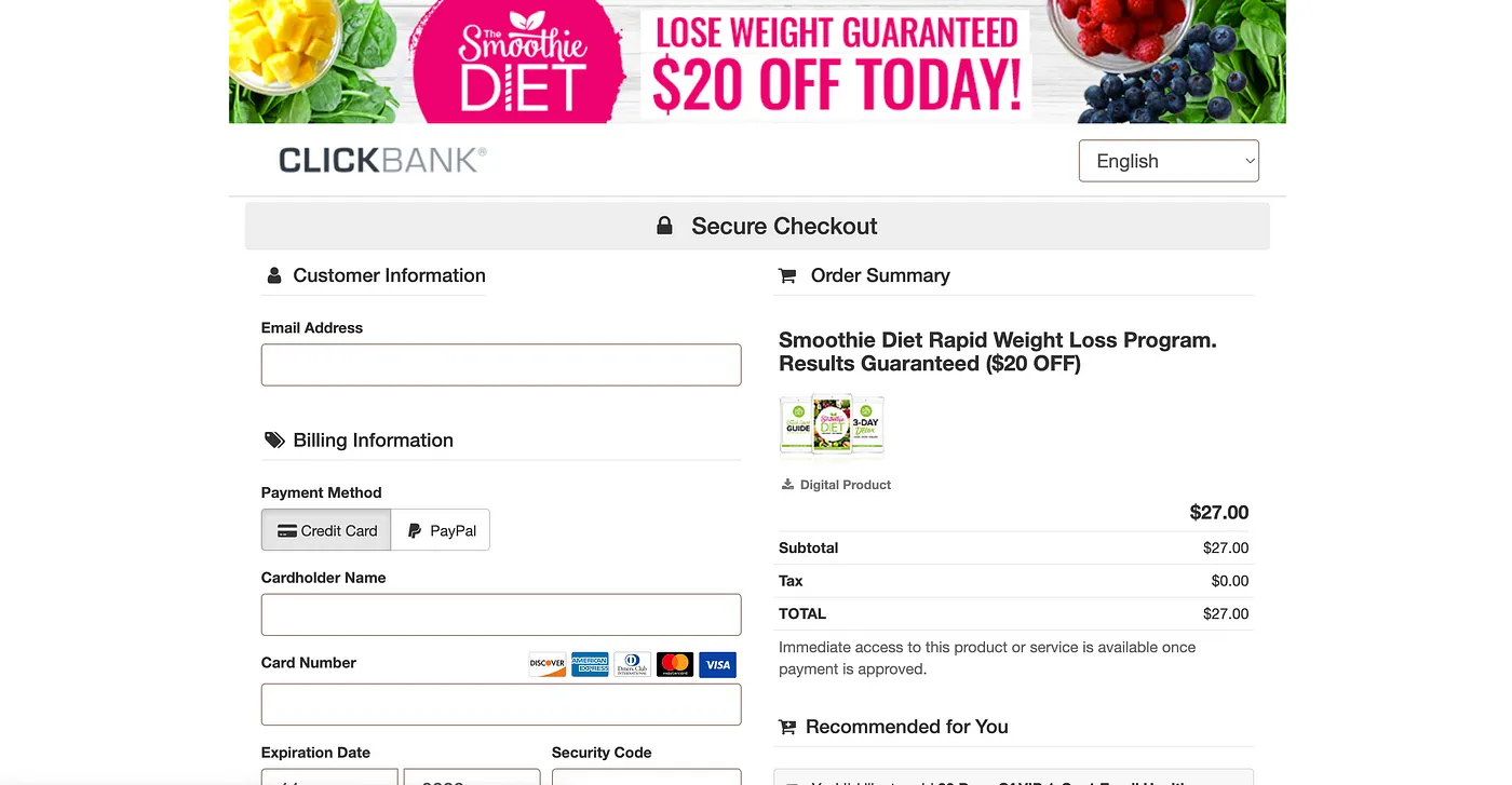 It includes a payment form, Q&A, and upsale items in the «Recommended for You» section.